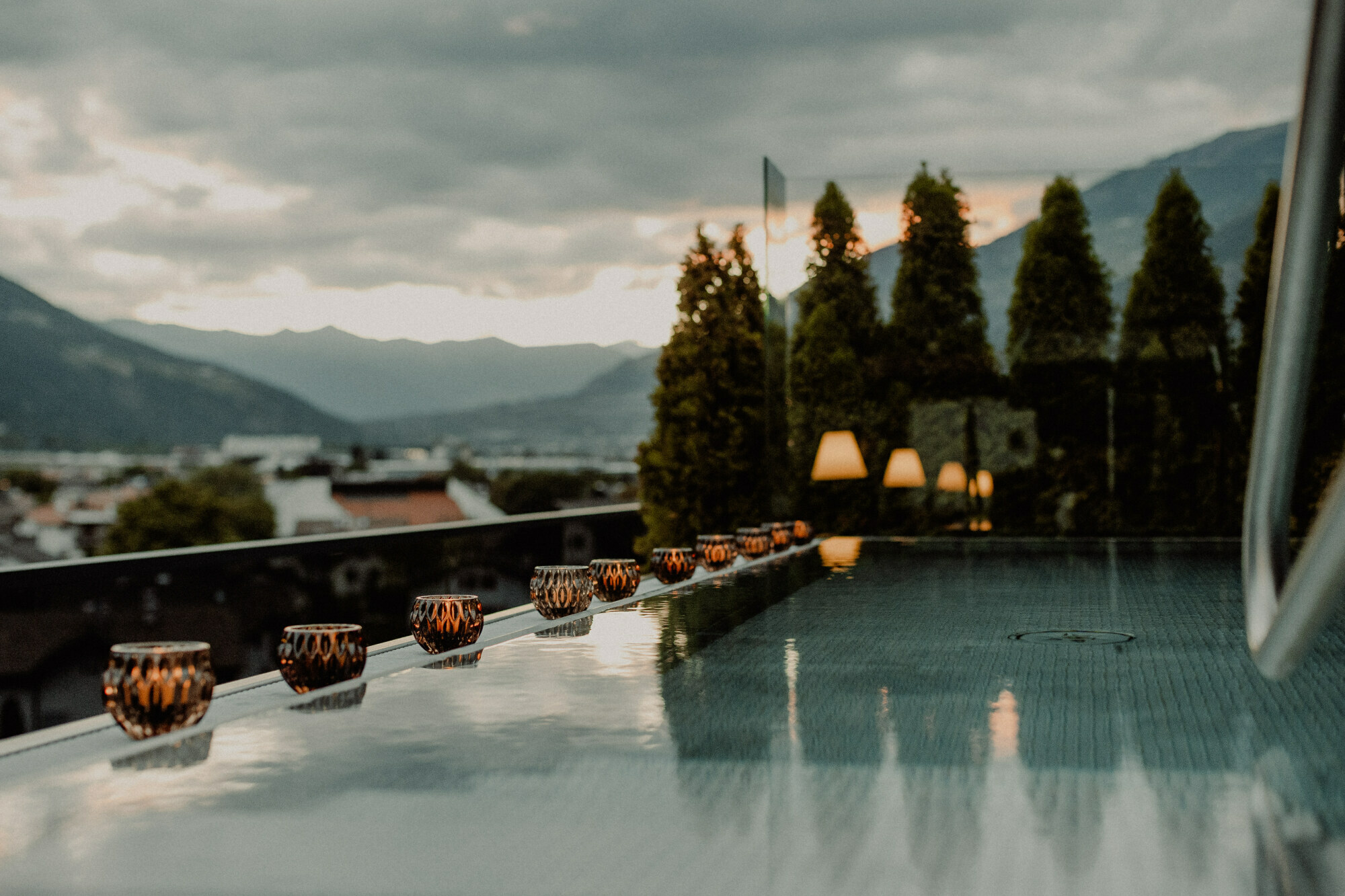 Ein weiteres Highlight in unserem Romantikhotel im Vinschgau. Ganz exklusiv könnt ihr nach dem Abendessen den Sky Spa genießen und den Tag in unserem Infinity Whirlpool ausklingen lassen - das geht bei Kerzenschein und Sonnenuntergang gleich vieeeel besser. Inklusive ist selbstverständlich eine Flasche Piris Prosecco.