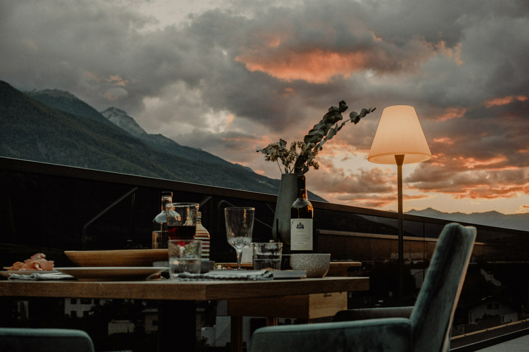 Unser Privates Dinner auf der Dachterrasse ist mittlerweile unser absolutes Lieblingsevent. Nachdem unser Sky Spa geschlossen hat, verwandeln wir unsere Dachterrasse im Handumdrehen in eine romantische Location für ein unvergessliches Abendessen über den Dächern von Latsch. Ein privater Kellner kümmert sich individuell um seine Gäste.